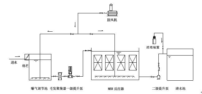 污水經(jīng)格柵除去飄浮和大顆粒懸浮雜質(zhì)后進(jìn)入調(diào)節(jié)池,(調(diào)節(jié)池不在一體化中),調(diào)節(jié)池中污水由提升泵提升進(jìn)入MBR處理設(shè)備中。對(duì)于生活污水、餐用污水,污染物濃度較高,可生化性較好,適宜采用好氧生物法進(jìn)行處理。好氧工藝是一個(gè)主要耗能單元,在選擇時(shí)應(yīng)考慮如何提高污泥負(fù)荷,降低投資費(fèi)用和運(yùn)行費(fèi)用。根據(jù)上述原則,結(jié)合設(shè)備特點(diǎn),參照國(guó)內(nèi)外污水處理研究成果及已建成的廢水處理站的運(yùn)行經(jīng)驗(yàn),本方案選擇膜生物反應(yīng)器作為主處理單元,膜生物反應(yīng)器是二十世紀(jì)末發(fā)展起來(lái)的水處理高新技術(shù),它將膜分離技術(shù)與生物處理有機(jī)結(jié)合起來(lái),主要應(yīng)用于污水處理領(lǐng)域。由于它既利用了膜分離的選擇透過(guò)性,又利用了生物處理有效性,出水水質(zhì)可滿足要求。在我國(guó)作為“八五”重點(diǎn)科技攻關(guān)項(xiàng)目的膜生物反應(yīng)器污水凈化裝置已進(jìn)入產(chǎn)業(yè)化,多元公司在國(guó)內(nèi)將該技術(shù)應(yīng)用于污水處理系統(tǒng)中,并取得十分顯著的社會(huì)、環(huán)境和經(jīng)濟(jì)效益。
